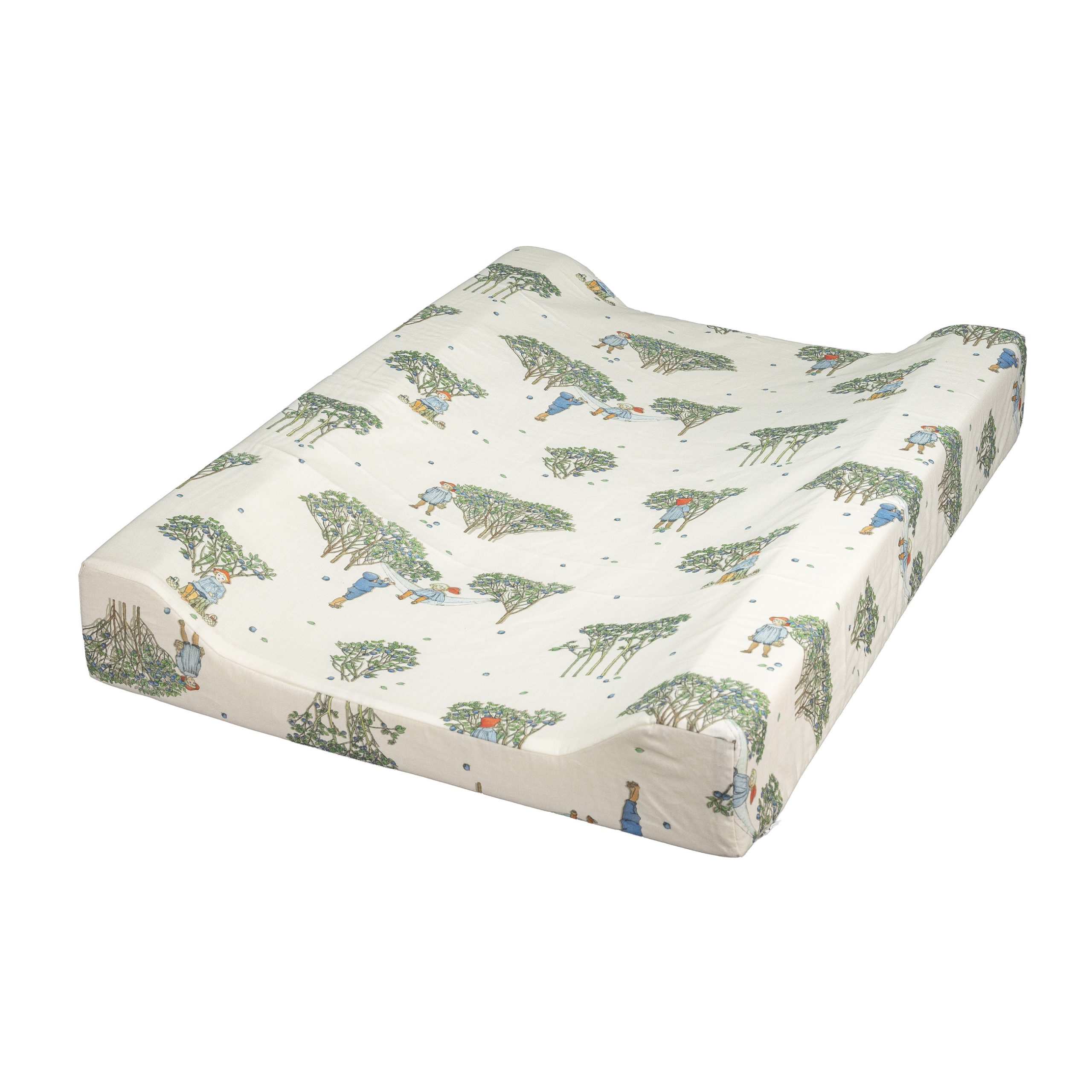 Praktisk skötbädd motiv från Elsa Beskow Puttes äventyr i Blåbärsskogen. Med en polyeterfyllning och upphöjda kanter ligger barnet mjukt och säkert. Skötbädden har en vattenavvisande yta som gör att den enkelt kan torkas av. Använd gärna ett extra bäddskydd så håller sig produkten fräsch längre. Yttertyget är certifierat enligt MADE IN GREEN by OEKO-TEX®, en spårbar etikett som intygar att det är testat och fritt från ämnen som kan vara skadliga för hälsan och miljön. Detta utförs genom certifiering i enlighet med STANDARD 100 by OEKO-TEX®. Dessutom garanterar MADE IN GREEN by OEKO-TEX®-etiketten att produkten har tillverkats med hållbara processer under socialt ansvarstagande arbetsförhållanden. Tillverkningskedjan kan spåras via en unik QR-kod på etiketten. Överdraget går att tvätta i maskin men tänk på att tyget kan krympa något. Plantorka och dra försiktigt i tyget så att fibrerna blir längre, när skyddet ska sättas tillbaka tänk på att inte ta i vid dragkedjan då sömmen kan gå sönder.